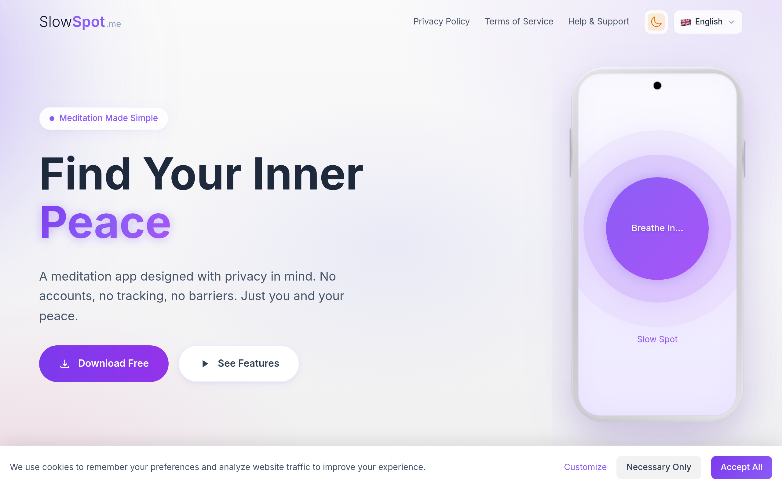 Zaprojektowaliśmy i zbudowaliśmy Slow Spot - aplikację mobilną do medytacji dostępną na iOS i Android. Aplikacja wyróżnia się pełnym poszanowaniem prywatności użytkownika - nie wymaga rejestracji, nie śledzi aktywności i działa w trybie offline. Oferuje 5 poziomów doświadczenia, 8 ambientowych ścieżek dźwiękowych i wsparcie dla 7 języków.